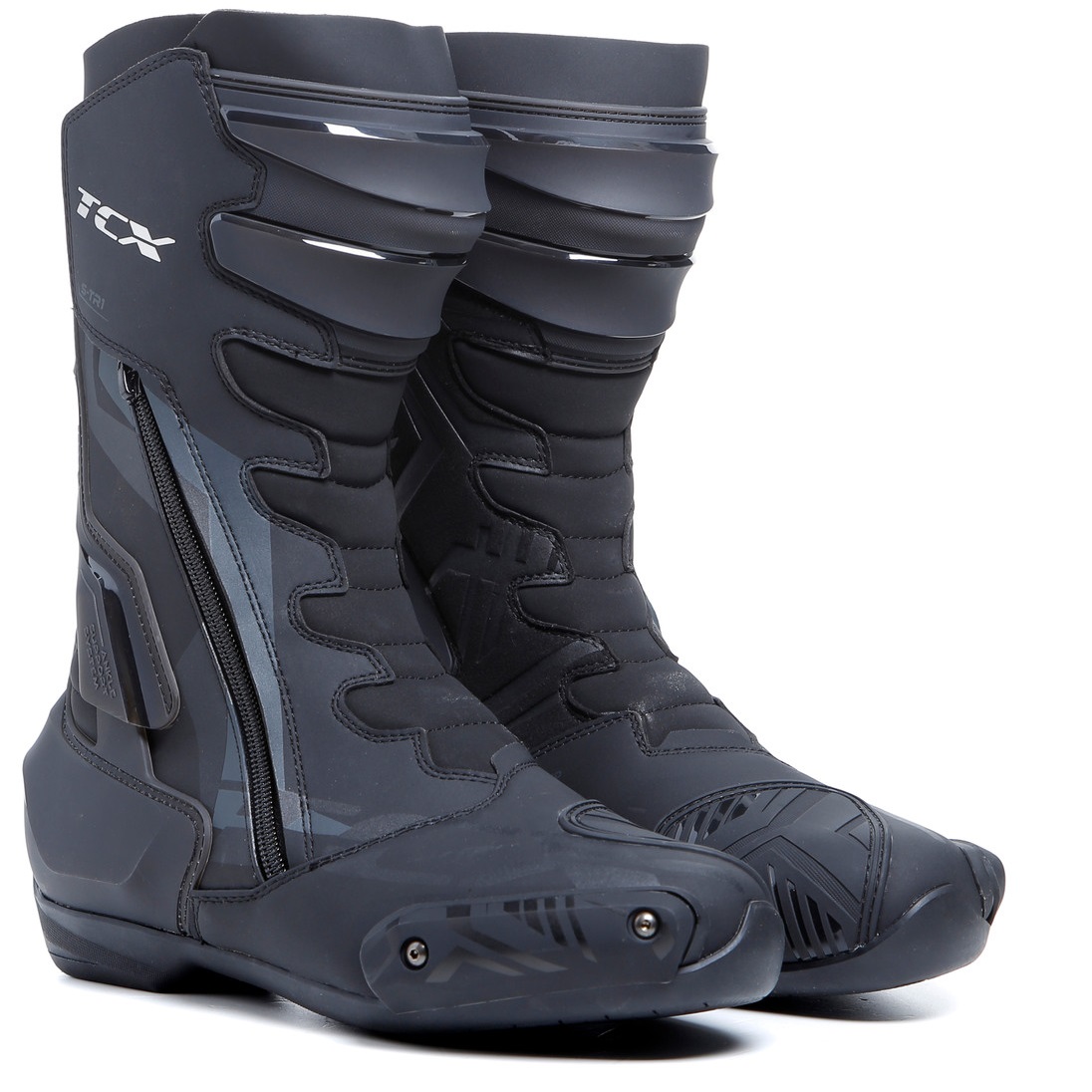 The S-TR1 sports boots are designed to protect the foot, foot joint and shin, providing the perfect balance between safety and comfort. Protection is guaranteed by the presence of a front rigid shield in TPU that works in synergy with the soft lower padding. The TCS® (Torsion Control System), a joint specially designed to accompany the ankle as it moves through its optimal range of action, guides the movement of the foot joint, thus avoiding the risk of unwelcome twisting, hyper-extension and hyperflexion. The Groundtrax® sole features a specially designed tread that ensures perfect grip on the motorcycle’s controls as well as on asphalt.