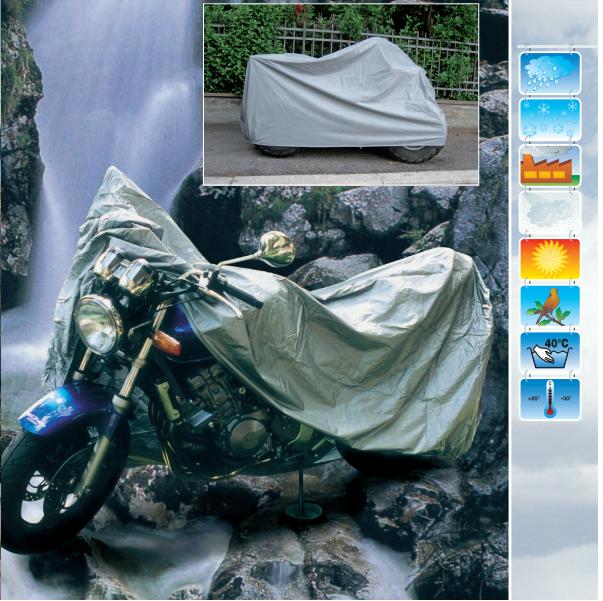 Bacall Basic Line PVC protects against weathering, dirt and pollutants. It is made of a softand durable plastic lm, which is UV-stabilisedand 100% waterproof. It guarantees a good basic protection against sunlight, rain, snow, frost,smog, pollutants, and dirt from birds and trees. MODELS: YAMAHA: TDM, XJR, XJ6, FZ1, FZ8, FJR, MT01, SUZUKI B-King, Hayabusa, Gladius; KAWASAKI ZZR1400, Ninja ZX-10R, HONDA: CB1300, VFR, DUCATI Multistrada, APRILIA Pegaso, Shiver ; Dimenzije (2xŠ+2xD x 2xH+Š) = 560x310cm Kat.br. MPES9