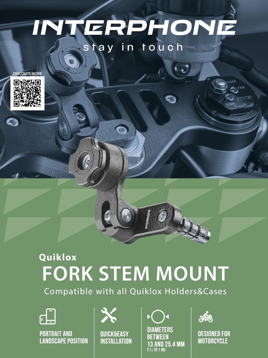 Quiklox is the new universal system to always carry your smartphone with you. Flexible and practical solution, if you too have a motorcycle with clip-on handlebars, QuikLox Fork Stem allows you to fix the smartphone holder inside the steering head. Universal holder, adjustable to fit internal diameters between 13 and 25.4 mm (1/2 to 1 in). Multi-adjustable allows you to direct your smartphone 360° horizontally and 90° vertically. Made of high strength plastic material and aluminum base Anodised. Package content: fork stem mount for motorbike, 2 expanding spacers, 2 spare large elastic rings, 2 spare small elastic ringsi, 2 allen wrenches for installation/adjustments. Kat.br. SMQUIKLOXFORKSTEM