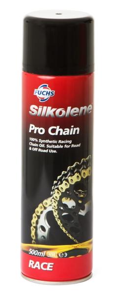 Sprej za lanac 500 ml; 100% Synthetic Racing Chain Oil. Suitable for Road & Off Road Use. For high performance road, racing and off-road motorcycles. 100% synthetic chain lubricant with exceptional anti-wear and anti-corrosion properties to resist high speed fling-off. For all chains including “O” and “X” ring types. Directions for Use: Apply sparingly to the inside of a clean warm chain. For best results leave overnight before use. FUCHS strongly recommend the use of FUCHS Silkolene Brake & Chain Cleaner prior to use. Kat.br. SI253